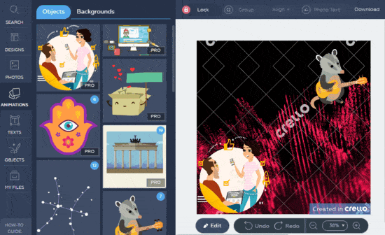 Remember, the animated objects and backgrounds are available in the PRO version of Crello only. That means you can use them in your design just to preview but cannot export them in the free version.