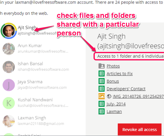 You can also click on the name of a particular person to find out what you have shared with that particular person. Revoke access option is also provided, but unfortunately this feature is not available yet. However, you can click on file/folder to access it directly on your Google Drive. After that, you will be able to manually change shared settings.