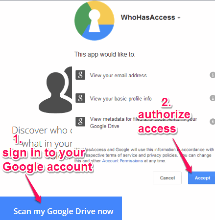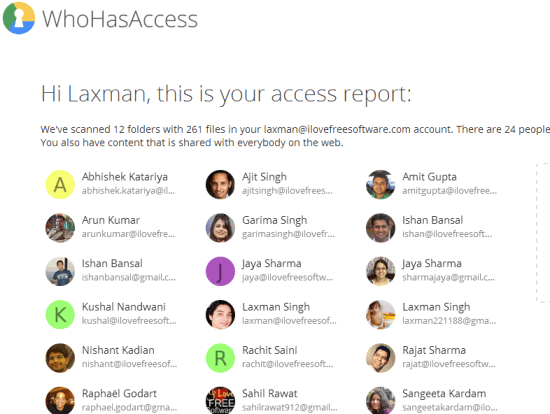 WhoHasAccess.com is a free webapp that helps to generates a list of all those people with whom your Google Drive files and folders are shared. Manually, it will be time-consuming to check each and every file/folder to know with whom you have shared your Google Drive content. But with this handy webapp, you can easily see all the people who can access your different shared files and folders in a single web page.
