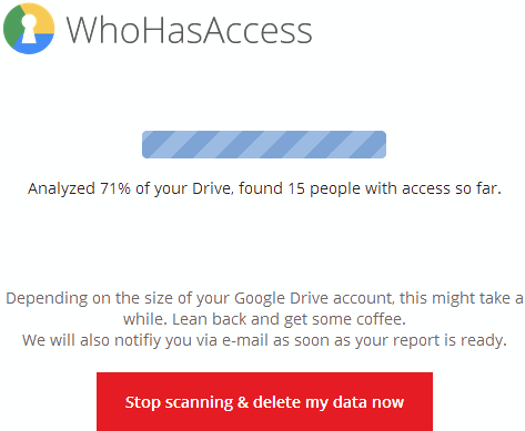 Step 3: After authorizing this webapp, it will immediately start scanning your Google Drive. During scanning process, it will also show you total number of people detected (so far) that can access your Google Drive content.