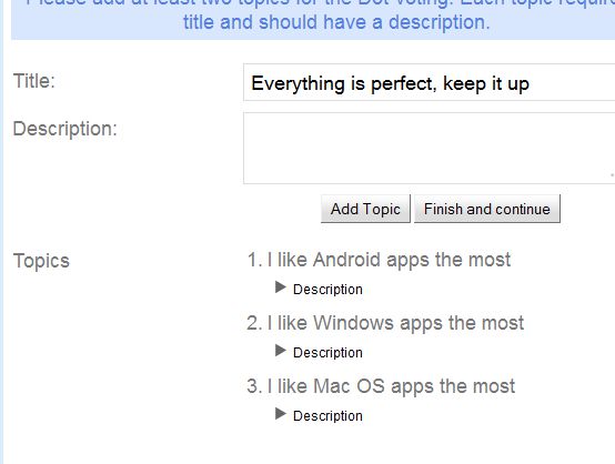 Poll answers or options, are called topics in DotVoting. You can add a bunch of them. In the step following this one you need to select the number of votes that the voters can give. This number can be anything you want, but try not to keep it too high, so you don’t annoy your voters with 50 votes or something like that.