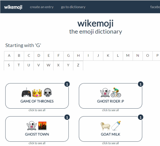 wikemoji is a free website that is used to create your own interesting emoji combinations and their meanings. The website is like a emoji dictionary, as they say themselves. You can create many different phrases using different emoji combinations. It provides all WhatsApp emoji’s and you can create a meaningful (that could be funny as well) combination and its meaning. From A to Z character, you can build your own emoji combinations or can discover meanings created by other users using emoji. Thus, it is a unique emoji dictionary where meanings are created with the help of emoji.