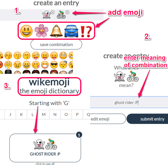 To create own emoji combinations and their meanings, go to the homepage of this website. You may use the link I have added at the end of this review. You don’t need to create account to use this website.