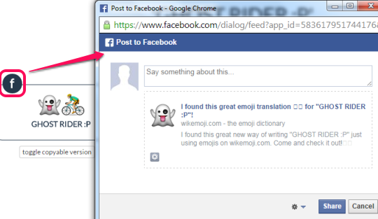Each emoji combination can also be posted to your Facebook account. You need to login with your Facebook account and authorize this website to publish the post.