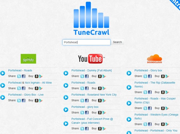 TuneCrawl is a free online music finder which you can use to search three different online music sources: Spotify, Youtube, and SoundCloud. Songs that are found can also be listened using a built-in player. You also get shortlinks to open them up on wherever it is they were found and shortlinks to Amazon and Google Play stores where you can buy the songs that you’ve searched for.