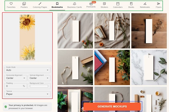 2. At the outset, choose the type of Print Mockup that you wish to generate such as Posters, Coloring Pages, Bookmarks etc. using the icons in the panel at the top of the age.
