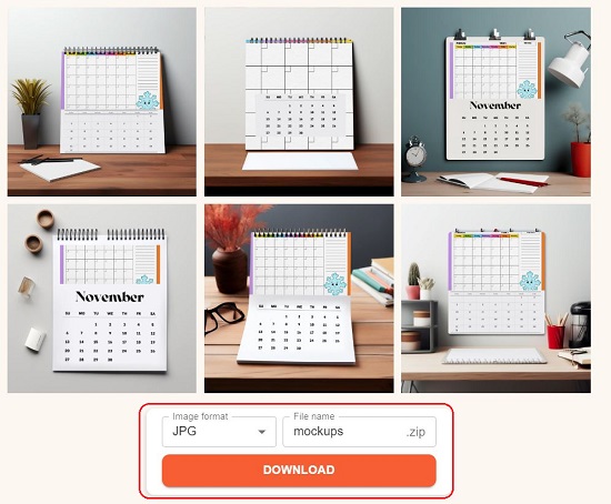 6. To bulk download the mockups to your computer, choose the image format (PNG, JPG, WebP), assign a name to the file and click on the ‘Download’ button to download them in Zip file format.