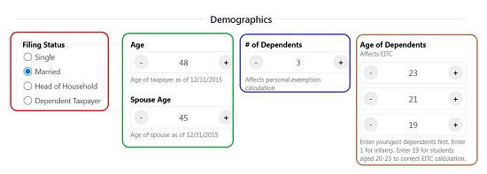 3. In the ‘Demographics’ section, choose your Filing Status that indicates if you are Single, Married, Head of Household or Dependent Tax Payer. Based upon this selection, a couple of additional fields will be enabled. For example, if you choose your Filing Status as married, then the application will also ask you the age of your Spouse and details regarding your Dependents (if any). Follow the instructions given below each field for proper input for information.