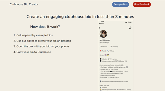 If you are unsure about what kind of bio you want to create, you can have a look at some of the pre-written Clubhouse profile bios from the “Example bios” tab given on the top right corner.