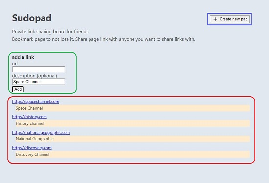 If you wish to share any website URLs that you found helpful or interesting, you can use the no-frills Sudopad free of cost. Only those people with whom you share the link will be able to access the shared board and add more URLs.