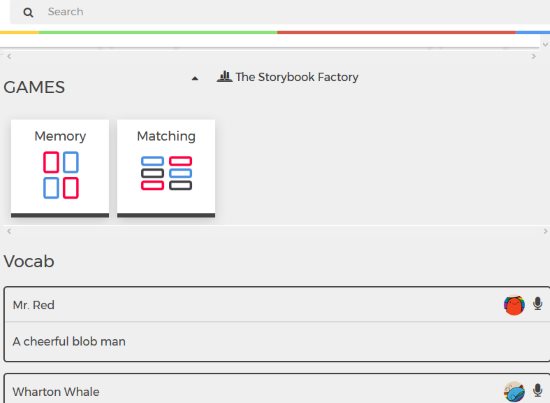 Below the games tiles you will also see a vocabulary section where you can find explanations or definitions of characters / words in the story. There is a mic icon at the end of each box as can be seen in the screenshot above. This mic icon can be used to check out the pronunciation of the word mentioned.