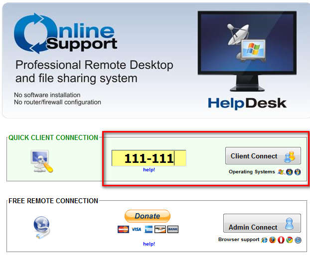 Online Support offers both viewing and control of the remote system, and the first step we’ve already described, clicking on the Admin Connect, when you do that you’ll receive a six figure number, something like this: