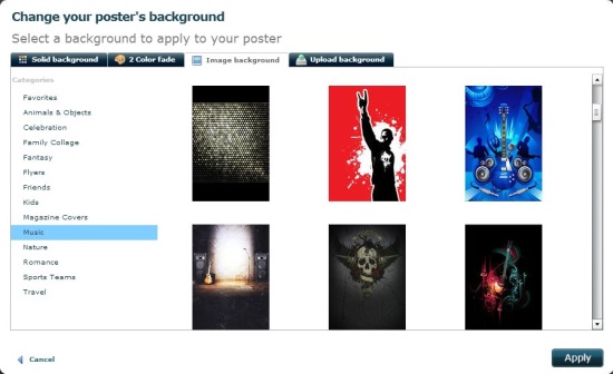- Variety of professionally designed poster backgrounds to choose from; available in different categories (Animals and Objects, Celebration, Friends, Family Collage, Music, Kids, Magazine Covers, Nature, etc.).
