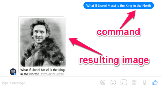 Once this Microsoft bot gets integrated with your Facebook Messenger, you will see a new user named “MurphyBot” in your chat list. Simply click on the username and you can start making hilarious images of celebrities by commanding the bot. As an example, I have entered the command “What If Lionel Messi is the King in the North” and see what this bot has generated in the below image. Funny, isn’t it.