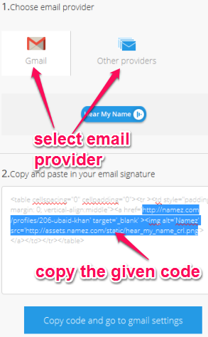 You can use Add to social profile option (available at right side on your account) if you want to share the link to your social networking accounts. Clicking on this option will provide you a unique code of your recorded name. Just above this option, Attach to mail signature option is present. This option will let you access a code. Using that code, you can attach the recorded name to your Gmail account signature or other service provider.