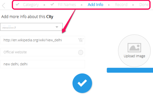 To record a name, you simply need to select a particular category. After this, you can type the name of that category (for example, city name for city category) in English. Apart from its English name, you can also type name in native language. This will help other users to let you view actual origin of that name. For each name, you also have the choice to add Wikipedia link, tags (helpful in search), any image, and official website (if available).