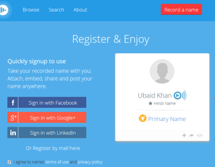 Namez (beta) is an interesting service that helps to record your name pronunciation. Recorded name can be shared with people and can be attached with email signature. Moreover, you can also post the link to your social networking accounts. This will help those people who face difficulty in pronouncing your name correctly. Not only your name, you can record any artist name, city name, or any other thing. This way, you could help your friends by sending them correct name pronunciations of any place or celebrity.