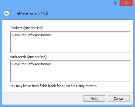 Third step allows you to add trackers and web seed to the torrent files that you’re creating. Trackers go in the upper text box, while web seeds go in bottom one. Several can be added, each new one goes into a new line. If you’re setting up DHT or PEX only torrents, you can leave these fields empty.