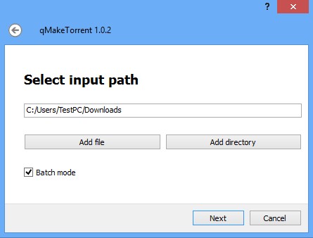 First step of the torrent creation setup requires you to select the input path. This can either be a file or a folder. Batch mode check mark in the bottom left corner of the interface will only work when you select a directory.