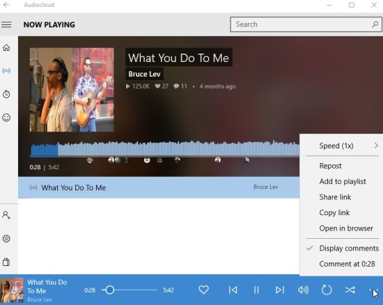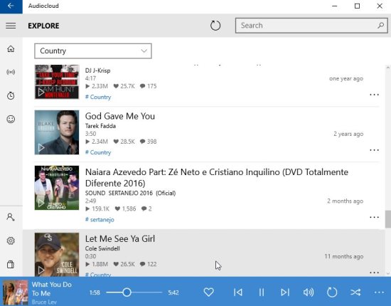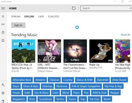 Audiocloud is a free Windows 10 music streaming app powered by SoundCloud to help you discover and listen to music from various artists, bands, etc. Apart from music you can also hear popular audio clips. You can browse through various genres of music, add songs to your playlist or favorites list.
