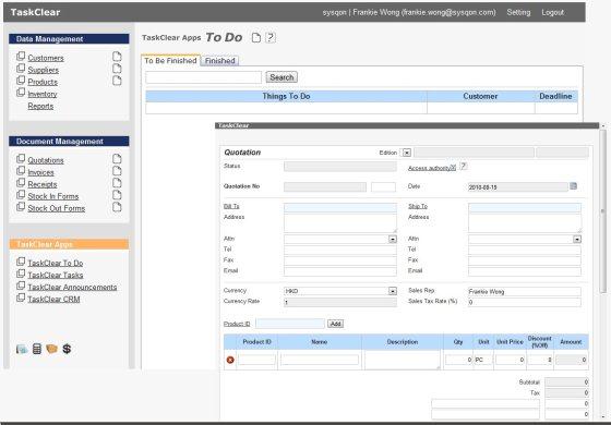 Let’s check out the various sections of this software. As far as the layout and navigation go it’s really simple software. The menus are arranged on the left side and the menu items are pretty much self explanatory. The default right frame of the graphical user interface gives an opportunity to search for unfinished or finished tasks. The left menu is classified in to three groups: Data Management, Document Management and TaskClear Apps. We are going to see each section in little detail.
