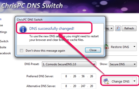 After selecting a DNS server, you can click on Change DNS button. Shortly, it will change DNS server for your network adapter. But to successfully apply new settings, you must clear browser cache.