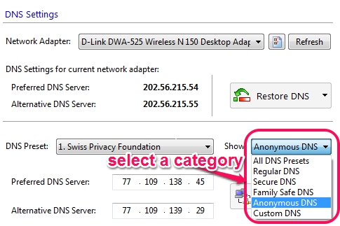 By default, your network adapter connects automatically with the DNS server provided by ISP. But you can quickly change DNS server using this freeware. All available DNS servers are divided into categories which you can select according to your requirement. For example, if you want to browse Internet anonymously or need a safe browsing, then you can choose anonymous DNS or secure DNS (that filters out websites). Multiple popular DNS servers, like Comodo SecureDNS, BlockAid USA, Norton ConnectSafe Family, OpenDNS, Google Public DNS etc. are available to change your default DNS server.