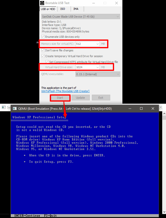 Step 2: Now, run the application and its interface will pop-up. You will see that it will automatically detect the USB drive. All you have to do is just specify the options for virtual HDD and virtual RAM. And after all set, hit the Start button. If all goes well, the bootable device will start booting just like the normal boot process.