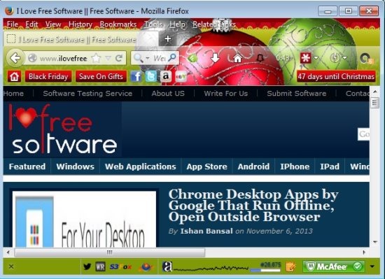 Christmas 2013 Theme extension for Firefox adds Christmas theme and Christmas countdown clock to Firefox. You can see Christmas countdown clock next to address bar. The Christmas themes makes your Firefox look like in holiday mood. In addition, it also provides direct links for some shopping websites, like, Amazon and eBay.