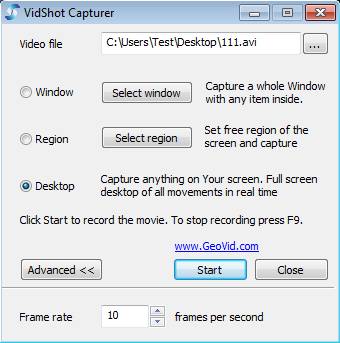 Additionally you can click on the Advanced button and change the frame rate from the default 10. You should probably set it to a something a bit more higher, the standard is anything between 20 and 25. Once that everything is configured and selected, you can click on the Start button which is gonna minimize the control panel to the system tray and of course record the desktop. Other two methods of recording desktop work a bit more differently. With them you also need to specify the window or the screen region that you want to record and save.