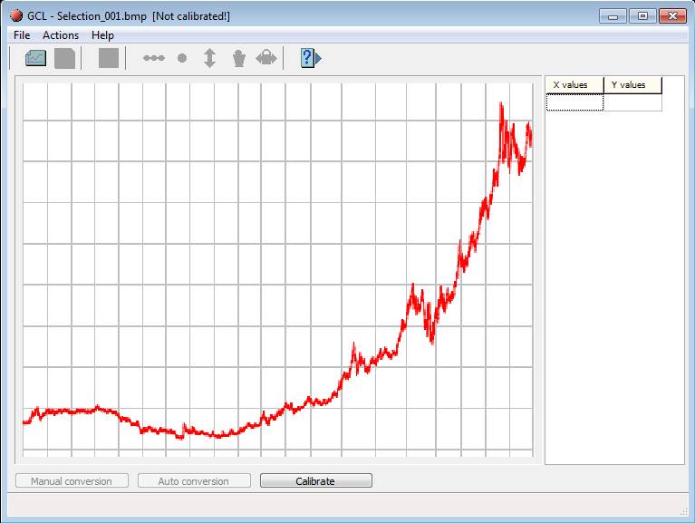 Interface of this free raster to vector graph conversion software can be seen in the image above. Graphs that you open will be imported to the large empty area on the left, while the calculated table of values of the graph is gonna be placed in the right sidebar. Top menu holds everything that you need for graph conversion.