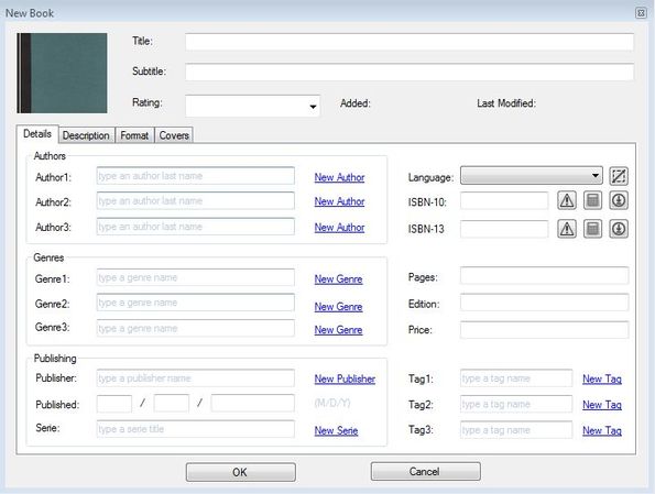 Web search is very useful for automatically adding ebooks, but let’s first show you how to do it manually. Select Book >> Add New which will open up the window which can be seen on the image down below.