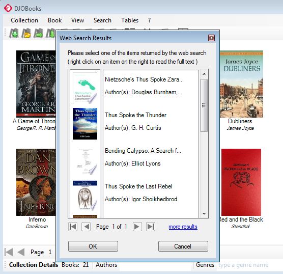 To do that, select Book >> Add Book From The Web. Small window will come up where you can type in book name. Once that you typed in book name, click OK and search should start right away. Another window will come up with a list of ebooks that you can easily insert with all the accompanying information into your collection. Existing eBooks from the collection can be managed using the top left corner toolbar.