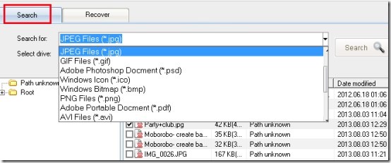 Search Tab is an important tab as it helps to search for deleted files of a particular file type. For example, you can search for jpeg images, gif images, text files, Adobe Photoshop Document (*.psd), png images, avi video files etc. Simply select a hard drive of your PC, then select any file type, and start the search. But here shortcoming of this software is that it is limited to only few image types, documents, and video format.