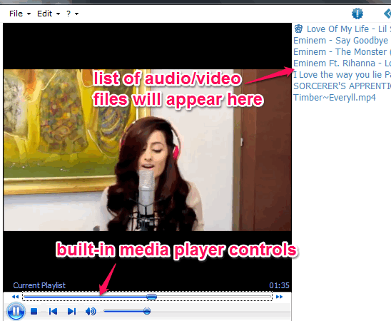It supports many popular audio video formats, like mp3, avi, wma, mpg, wav, mp4, and wmv. To play audio video files, use File menu and click Open button to add a media file from source directory. After that, it will start playing that audio or video file. List of all supported audio/video files present in that directory will also be created automatically.