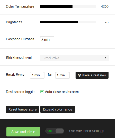 The screenshot above shows the full interface (with advanced settings) of this eye protection software.