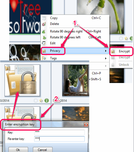 To encrypt photos with password protection, select multiple photos or an individual photo available on its interface. After this, right-click there, and click on Encrypt option present under Privacy option. It will open a small box in which you need to enter the desired password (or key). Click OK button to save the changes and those photos will be encrypted immediately.