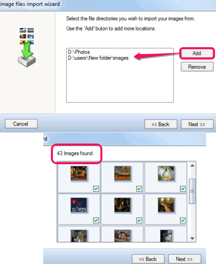 While opening its interface for the first time, a wizard will open to import photos from required folder. You can follow the wizard to add photos on its interface automatically.