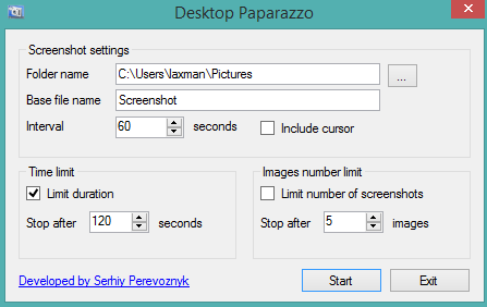 Desktop Paparazzo is another good software in this list. You can configure multiple options before taking the screenshots automatically. For example, you can set time limit to stop capturing the screenshots, enter the number of screenshots to capture in that time duration, add prefix to screenshot name, etc. Option to include/exclude cursor is also available. So multiple features make it a handy software. Screenshots are saved in PNG format.