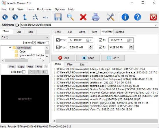 For simply viewing all the files created and Modified within a certain date range, you need to first select the directory and then click on Modify or Created tab on the interface and then fill the date range. You can also choose to fill the time range as well if you want it to precisely show you the files between the time range between the chosen date. Once you have entered both date and time, you just need to click on Scan, and the results are shown within a few seconds on the interface. They are listed separately as Items, Files, and Logs.