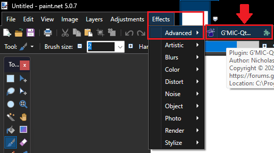 - Now, start Paint.net and then a new Effects > Advanced > G’MIC-Qt menu will appear.