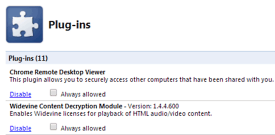 Step 2: You should now be on the plugins sub-section of Google Chrome. This page lists all the standard (and third party) plugins currently active in Google Chrome.