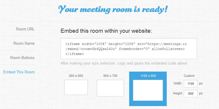 With this code meeting room can be embedded directly to your website. Once last thing, once you open up a meeting room, protection to it can be added in the top right corner of the screen.