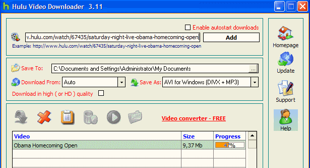 Hulu Video Downloader is a free download manager to download Hulu videos. It is very simple to use, and completely free. To download a Hulu video, just add its URL to Hulu Video Downloader. Then, Hulu Video Downloader will start downloading the file, and save it on your PC. You can choose to save the downloaded file in many formats: .avi, .mpeg, .wmv, .flv file. This ensures that you can play Hulu videos on your iPod and iPhone as well, apart from your computer. If you need to convert these saved files to some other format, you can try Free Video Converter.