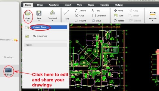 Start uploading desired files and edit them easily via available tools in AutoCAD WS. For uploading a file, you need to click on the Open option available in Home menu under Editor. Click this option and it will provide you Upload Files option. Hit this option, and a small pop up will open up. In this pop up, just click on the available Browser button and it will open a small window.