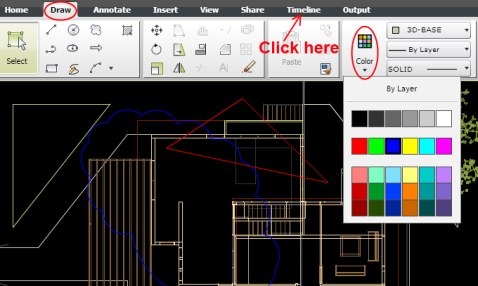 For editing the desired drawing, there are multiple tools available at the top side as you could see in the below given screenshot. Tools such as: Line tool, Circle tool, Cloud tool, Hatch tool, Polyline tool, arrow tool, Freeline tool, arc tool etc. available under Draw menu (see the below mentioned screenshot). You just need to select the right tool at the right place. In addition to it, there is an option available for changing the color of tools according to your need.