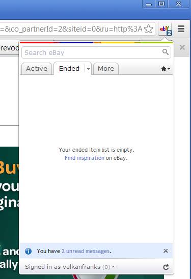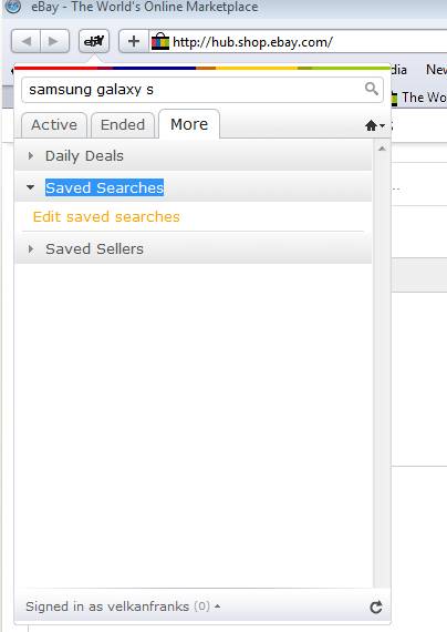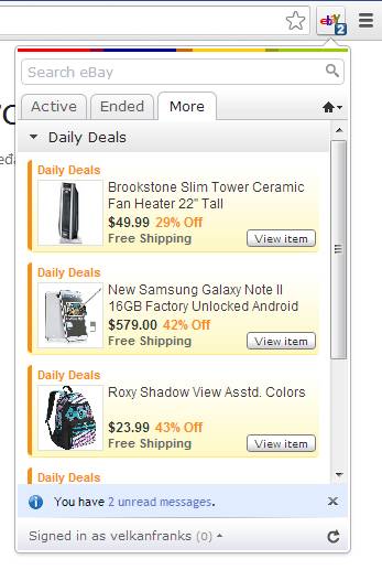Usage is basically the same like it was in Firefox. If you want to search for something that you’re interested in, on eBay, you’re gonna have to click on the search input box at the top of this eBay ad-on. After you enter in a search term and hit Enter, you’ll be redirected to eBay where you’ll be able to view the results. Go through tabs in order to view Active and Ended auctions and sales that you were participating in and More to view daily deals.