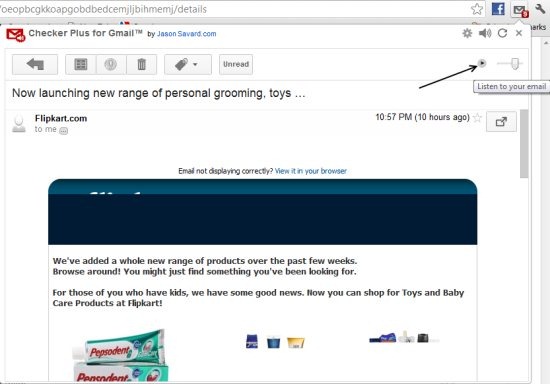 - As you can see, the particular e-mail is opened in the same window. Another interesting feature allows you to listen to your e-mail. Simply click on the icon as shown by the arrow.