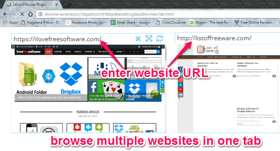 Janus Workspace is a free split screen Chrome extension to open multiple websites in one tab. This extension can help you open up as many websites as you want in one single Chrome tab. After installing this extension, it will allow you to split the screen of a new tab into multiple web frames and then open a separate website in each web frame. The best part is that each of the web frames come with their own navigation, making it easier for you to browse multiple websites separately in one tab. It also allows you to change the size and margin of the web frames such that the frames are not distorted.