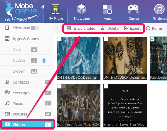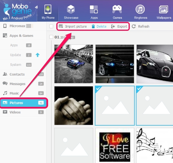 Sidebar helps to quickly access items without moving back and forth. For example, if you wish to access Pictures of your smartphone, then simply click on Pictures option and you will be able to view all the images available on your smartphone. Apart from viewing those images, you can manage Pictures section by importing new pics from PC, deleting unwanted pics, and exporting pics to PC as a backup.